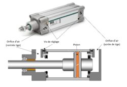 Dans un vérin simple effet, un ressort est imbriqué et permet alors au vérin de revenir à sa position initiale. Dans un vérin double effet, il faut appliquer des pressions alternativement de chaque côté du piston pour que le vérin puisse aller dans un sens ou dans l’autre.