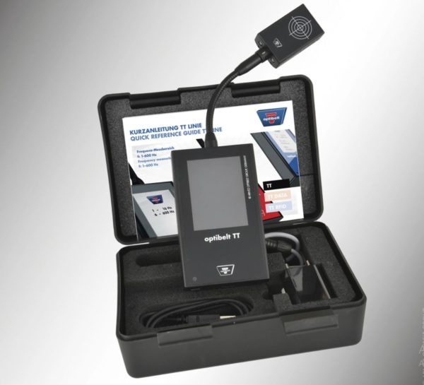 L’appareil de mesure optibelt TT – permet le contrôle de la tension des courroies de transmission par la mesure de la fréquence. Il offre grâce à sa forme compacte des possibilités d’utilisation universelles pour les transmissions dans la construction mécanique, dans l’industrie automobile et pour de nombreuses autres applications. Même dans les endroits difficiles d’accès, l’optibelt TT peut être utilisé sans effort, si bien que la tension des courroies trapézoïdales, courroies trapézoïdales striées et courroies dentées peut être vérifiée de manière simple et rapide. L’appareil est immédiatement prêt à l’emploi dès son allumage. La tête de mesure doit être maintenue au-dessus de la courroie à mesurer (deux points lumineux à LED rouge aident au bon positionnement). Ensuite, la courroie tendue est soumise à une vibration (une frappe avec le doigt suffit). L’optibelt TT commence la mesure et indique le résultat en Hertz [Hz]. La propriété, la couleur et le type de courroie n’influencent pas la mesure. Pour connaître les recommandations de tension, se référer aux indications d’Optibelt et au calcul CAP.