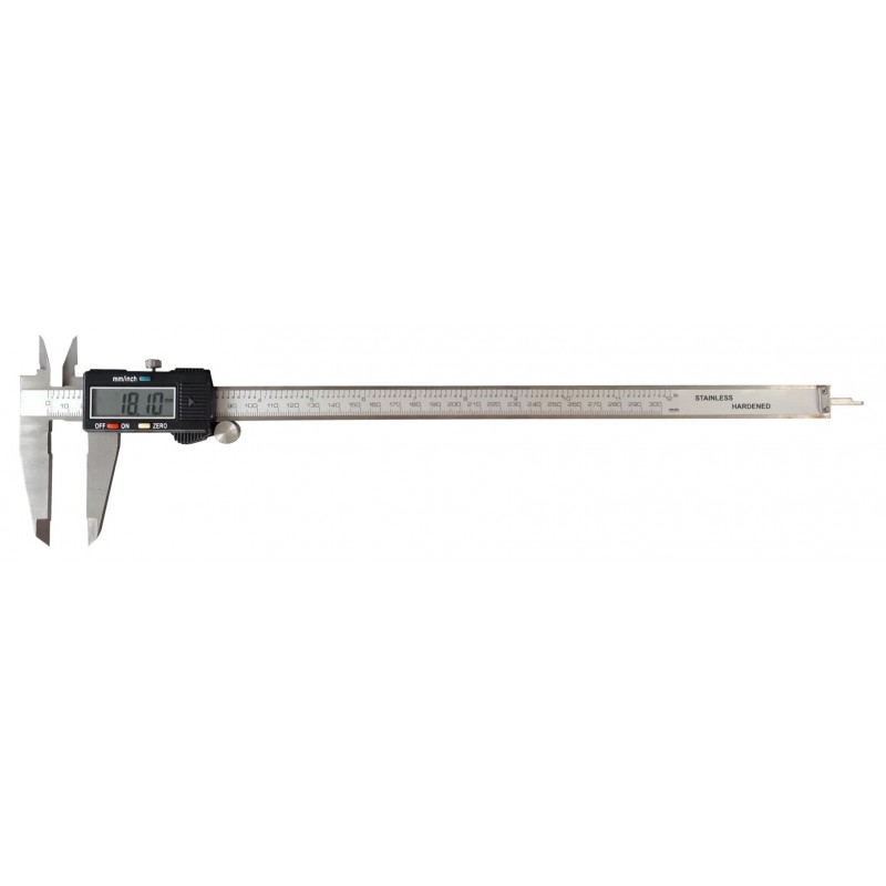 Pied à coulisse digital 300 mm au 1/100 mm, muni d’un double bec pour des mesures intérieures et extérieures, ainsi qu’une jauge de profondeur. Il est livré avec 1 Pile 357 incluse + 1 pile Pile 357 de remplacement et dispose d’une extinction automatique pour augmenter la durée de vie de la pile.
